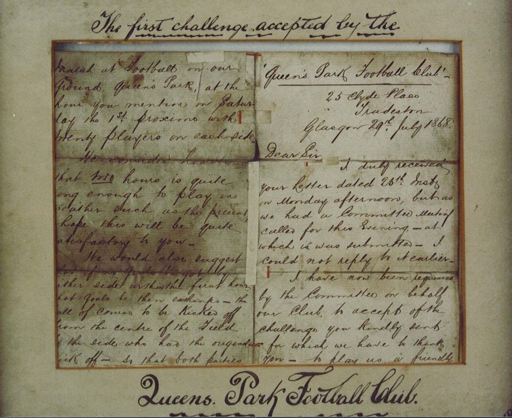 One of my favourite documents in the collection of the Scottish Football Museum is a letter from 1868 organising the first known challenge match involving Queen’s Park. For many years we thought that this game was the first under the association code (or at least a variation of it) to be played in Scotland. The game against Thistle FC, who were based at Glasgow Green, took place on the Queen’s Park recreation ground on 1st August 1868 and resulted in a 2-0 win for the home side. The letter which makes the arrangements is one of three that are known to exist. Two of these sit within the Queen’s Park FC collection at Hampden Park whilst a third independently came up at auction a number of years ago. The one sitting on display in the museum is the actual letter which was sent to the secretary of Thistle FC. The other letter in the Queen’s Park FC collection and the one that was sold at auction are the original ‘committee’ copies from 1868 which would have been circulated at the time of arranging the match.