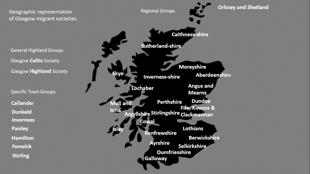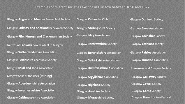 Migration into Glasgow and the west of Scotland was significant over the span of the nineteenth century and accounts for much of the population rise. With insufficient welfare provision and often turbulent economic prospects the danger of destitution was a threat for many arriving in the large towns and cities. Associations and Societies rapidly sprang up in response, providing migrants with an opportunity to meet up and interact with people from their place of origin. This experience was not unique to Glasgow but the scale of this development was significant. In many respects these societies were mutual aid organisations as a major part of their existence was to support people if they fell on hard times in the city. The accompanying slides provide examples of the migrant societies existing in Glasgow from 1850 to 1872 and their geographic representation of Scotland as a whole. As well as being a provider of welfare, the societies also did much to promote and celebrate the traditions and cultures of their native land. There are examples linking some of these societies to the promotion of traditional sports, including football, within their activities.