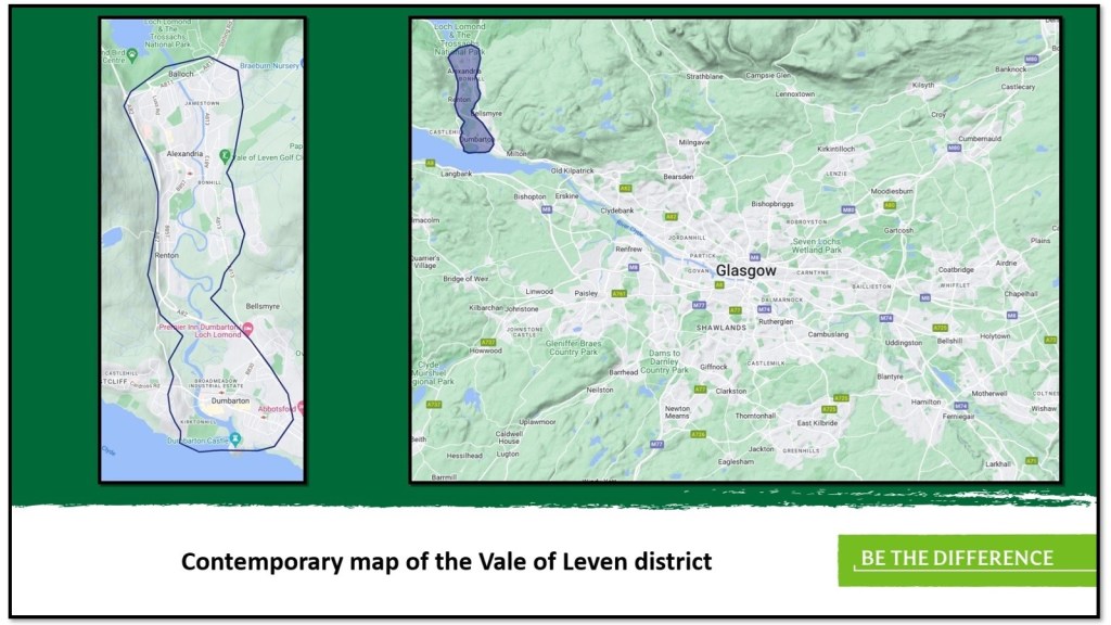 The Vale of Leven district is situated within West Dunbartonshire and lies approximately 13 miles to the northwest of Glasgow as the crow flies. The valley itself is about five miles in length and follows the River Leven on its journey from Loch Lomond in the north down to Dumbarton where it becomes a tributary to the River Clyde.