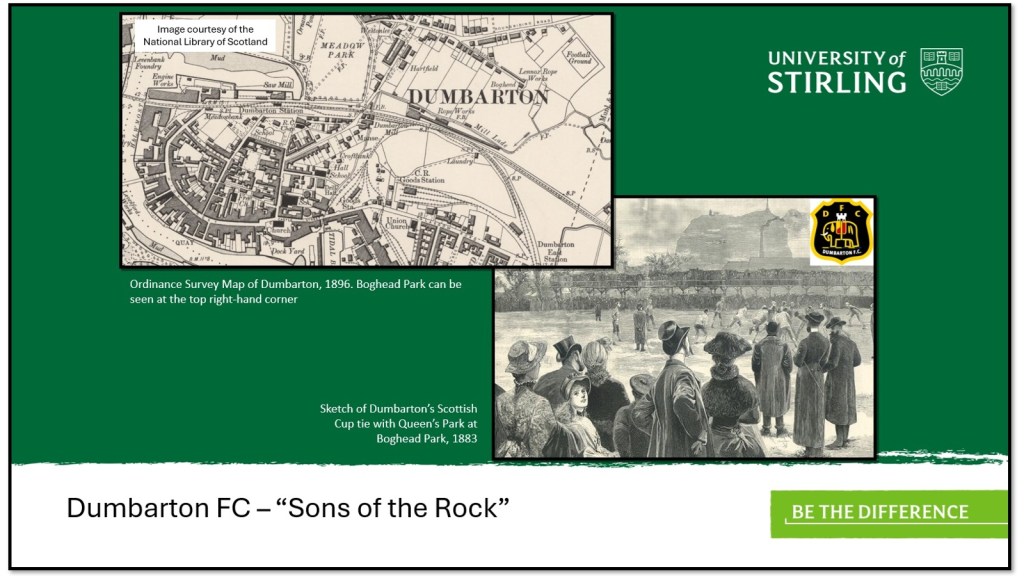 The coastal town of Dumbarton, comfortably the largest population centre within the study, provides a more diverse spread of occupations. Dumbarton’s waterfront was dominated by its trademark volcanic rock as well as by the local shipbuilding industry. While the latter industry accounts for a significant number of workers connected to the local football club, other occupations include law clerks and cabinet makers. The earliest history of the club suggests a strong shinty influence amongst the early founders.[7] For a period, Dumbarton FC were based at Townend, not far from Dumbarton Central Station, but made the short move to Boghead Park in 1879.