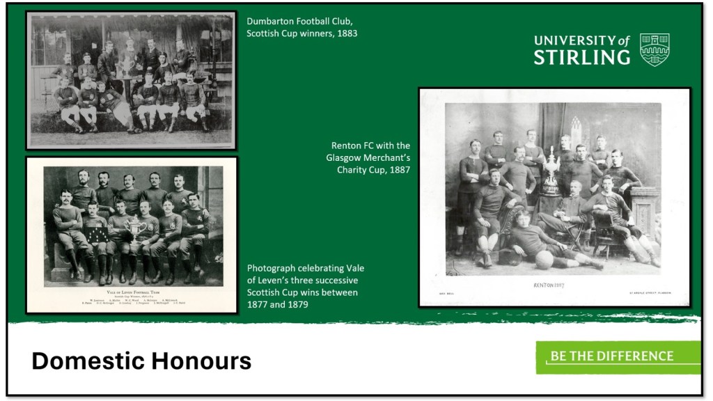 The three clubs enjoyed specific periods of success. For the Vale of Leven club, the mid to late 1870s saw the club reach its peak. The Vale became the first club to defeat Queen’s Park FC when they won a controversial Scottish Cup tie at Hampden Park by two goals to one in 1876. From that noteworthy achievement they would go on to win the trophy three years in succession. On the back of their success a silver chalice, referred to as the Loving Cup, was presented to the 17 players who had played across the three finals. For many years the Loving Cup became a focal point for annual gatherings, with the old players meeting up to reminiscence about their sporting achievements.
