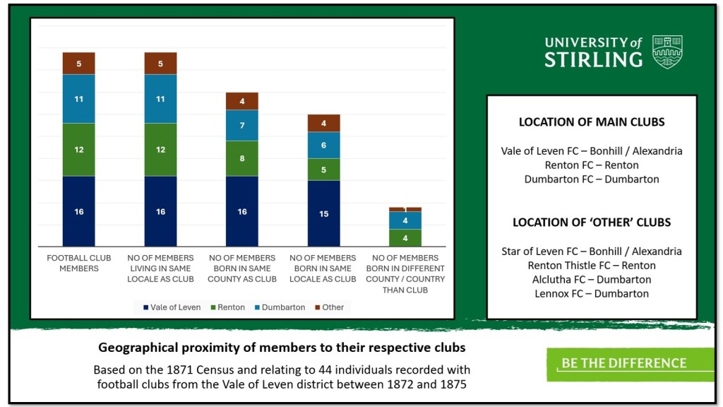 As part of this presentation, a study was undertaken of 44 football club members from the Vale of Leven district between 1872 and 1875. This was done to get a better understanding of the socio-economic status of the club members by identifying their occupations as well as finding out where they lived and where they had been born. A large majority of the club members are linked to the three main clubs (Renton, Dumbarton and Vale Of Leven) with just five of the sample coming from other clubs. This is mainly down to the difficulty of tracing early team information for club members outside of the “big three”.