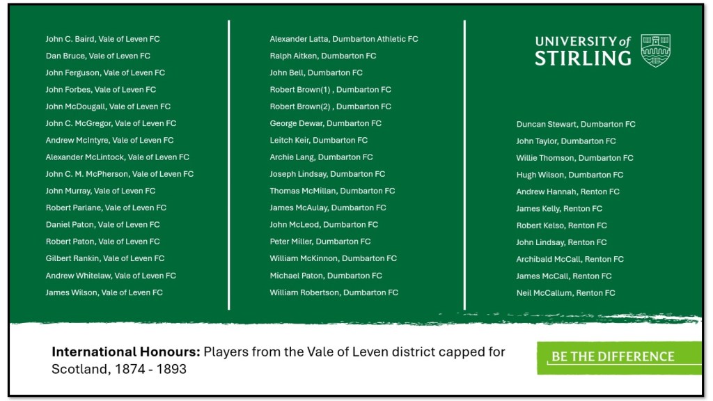 Players from Dunbartonshire were a regular feature of Scotland teams between 1874 and 1893. In total, 43 players from the Vale of Leven district were capped for Scotland during this time. One of the most notable contributions came in 1878 with Scotland’s 7-2 victory against England. Three players from Vale of Leven FC featured in this game and one of them, John McDougall, became the first Scot to score a hat-trick at international level. In the 1884 international against England five players from the Vale of Leven district were selected. Even with the significant loss of players to clubs across the border post 1885, the Vale of Leven teams continued to be an important supplier for Scotland.