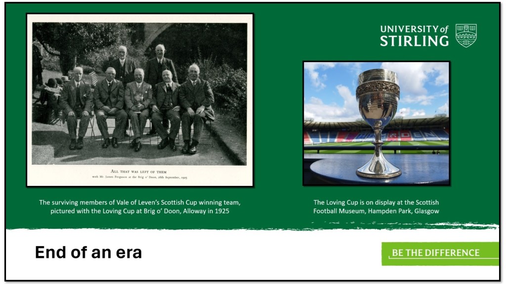 All three clubs were founding members of the Scottish Football League in 1890 but the advent of professionalism in Scotland, three years later would have an adverse effect as each club struggled to compete in a rapidly changing market. From being Scottish Cup finalists in 1895, Renton would be forced to resign from the Scottish Football League only four games into season 1897-98. The club largely struggled thereafter and folded altogether in 1922. Dumbarton, despite their early League success, struggled in the years leading on from professionalism. Having been wound up in 1901 the club was reconvened four years later and has largely remained in the lower divisions of the senior game. At the end of season 1891-92, Vale of Leven FC had to drop out of the Scottish Football League after failing to win a single game. They remained in the lower levels of the senior game until being wound up in 1929. The present junior club bearing the same name was established a decade later. The old Vale of Leven players from the great cup winning era continued to meet up until well into the 1920s. By 1933, Andrew McIntyre and John McPherson, by then the last surviving members, were in agreement that the silver chalice be presented to the Vale of Leven District Council. This duly happened in January 1934. The Loving Cup has been loaned to the Scottish Football Museum for display for the past 23 years and alongside documents and artefacts from the Renton FC collection, will help to recount the story of the footballers from the Vale for generations to come.