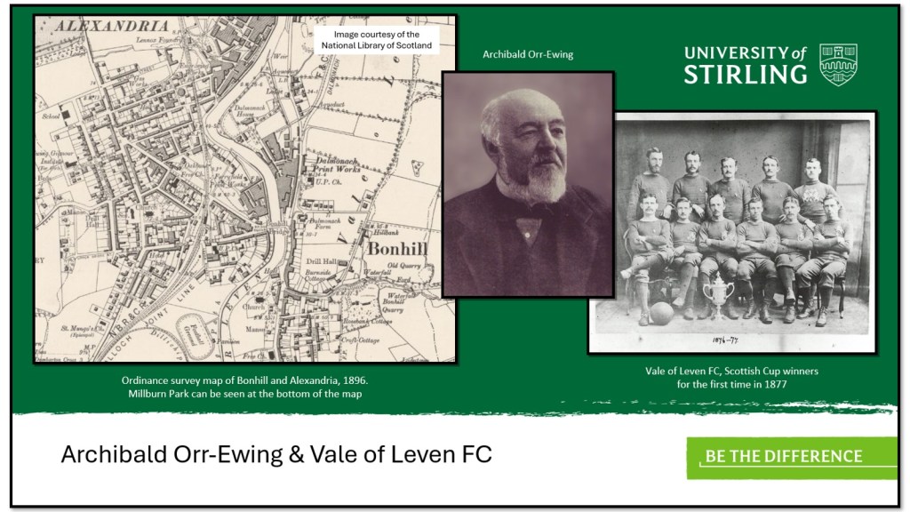 As mentioned earlier, the Vale of Leven district was a major centre for the dying and calico print industry. Local magnates like Alexander Wylie in Renton and John and Archibald Orr-Ewing in Alexandria and Bonhill were dominant figures. Matt McDowell argues in his PhD thesis from 2010, that “Sport in the Vale was co-opted by the didactic regimes of Alexander Wylie and the Orr-Ewing family as a means of creating solidarity and respectability amongst its workforce”.[6] The dye works most closely connected to Archibald Orr-Ewing in particular supported the rise to prominence of Vale of Leven FC. Early on, the football club was able to secure access to a local field before opening a ground at North Street Park. A more permanent home was found in 1888 when the Vale occupied Millburn Park. The Vale of Leven players were also excellent at shinty, and the club would win the Glasgow Celtic Society Cup in 1880.