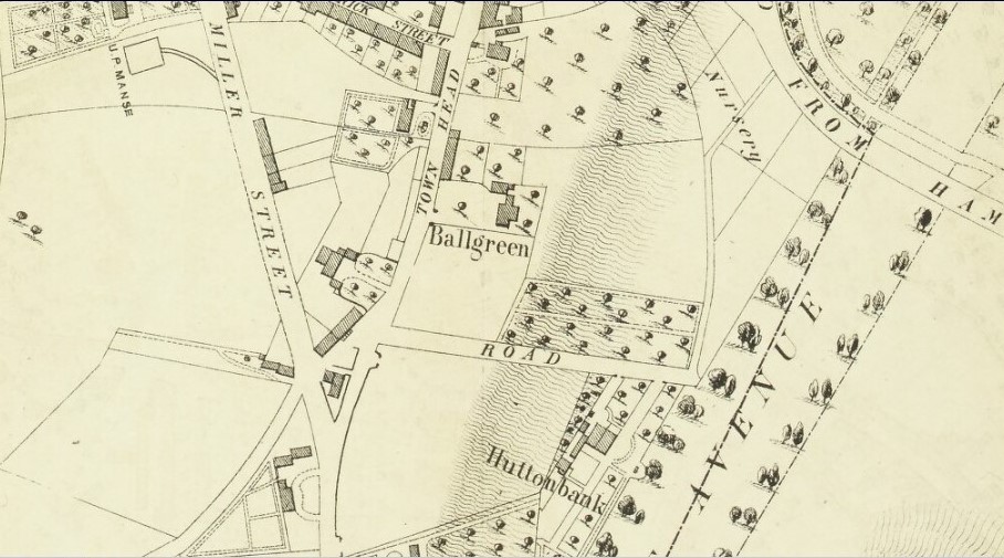 Image detailing the ‘ballgreen’ in Hamilton from a survey by Thomas Boyd in 1855. This image is reproduced in the article on Ba’ Greens – see The Ba’ Green – Scotland’s ancient playing field. The location of the small area of land referred to as ‘South Haugh’ in the 1898 ordinance map can be found on the other side of the road from the ballgreen. The survey highlights a level strip of land with Carlisle Road and Townhead Street running along on one side and a slope on the other side leading down to the Duke of Hamilton’s ‘Great Avenue’. Reproduced with permission of the National Records of Scotland.