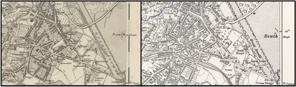 A side by side comparison of ordinance survey maps published in 1864 and 1898. The large expanse of the South Haugh can be seen in both. It was a fairly straight walk from Hamilton Central Station along Duke Street, Miller Street and onto Carlisle Road to access the South Haugh. Interestingly, the 1898 map details a small area of the South Haugh on the western edge of the Great Avenue. It is half a mile from the train station (the distance referenced in the Scottish Football Annuals). Could this be the site of the ‘South Haugh’ football pitch? Reproduced with permission of the National Library of Scotland.